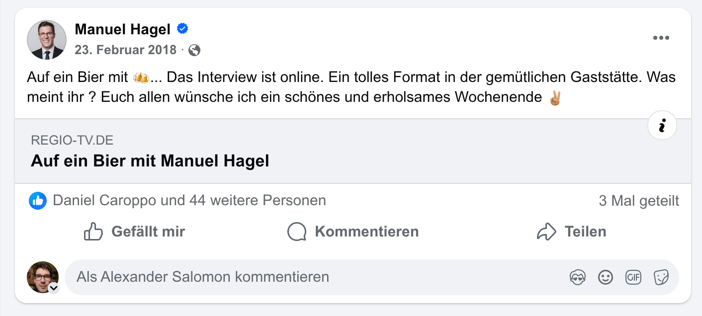 Facebook-Post am Abend des Auftritts. Hauptteil am Tag danach: Es habe „wirklich Spaß gemacht“. Eine „gemütliche Atmosphäre“. Ein „belebtes Gespräch“. Einschalten um 19:30 Uhr.